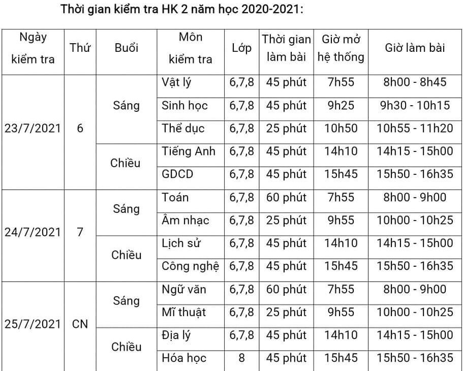 2. Từ ngày 23 đến 24/7/2021, nhà trường tổ chức kiểm tra học kỳ 2 cho học sinh các khối 6,7,8 trực tuyến trên hệ thống: http:/study.hanoi.edu.vn