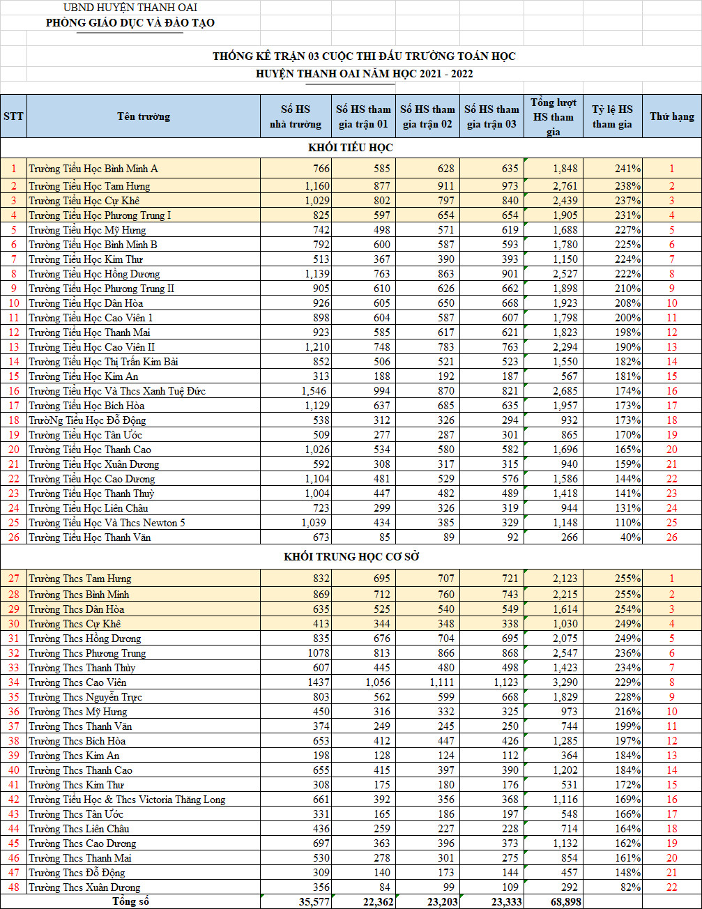 Dưới đây là thống kê trận 03 cuộc thi Đấu trường toán học huyện Thanh Oai năm học 2021-2022